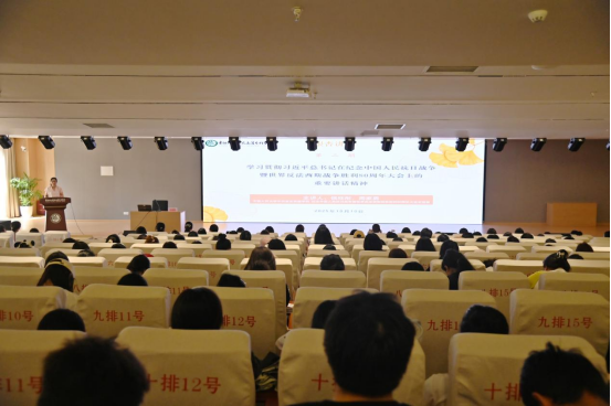 2025年10月10日上午,贵阳幼儿师范高等专科学校思政部“银杏讲堂”第二期同上一堂思政大课在教育教学培训实训综合楼210报告厅开讲。本次活动以“学习贯彻习近平总书记在纪念中国人民抗日战争暨世界反法西斯战争胜利80周年大会上的重要讲话精神”为主题,特邀中国人民大学中共党史党建学院志愿者侯欣彤、周家男两位同学担任主讲,全校思政教师、学生骨干及新青年学习社成员等300余人到场聆听。